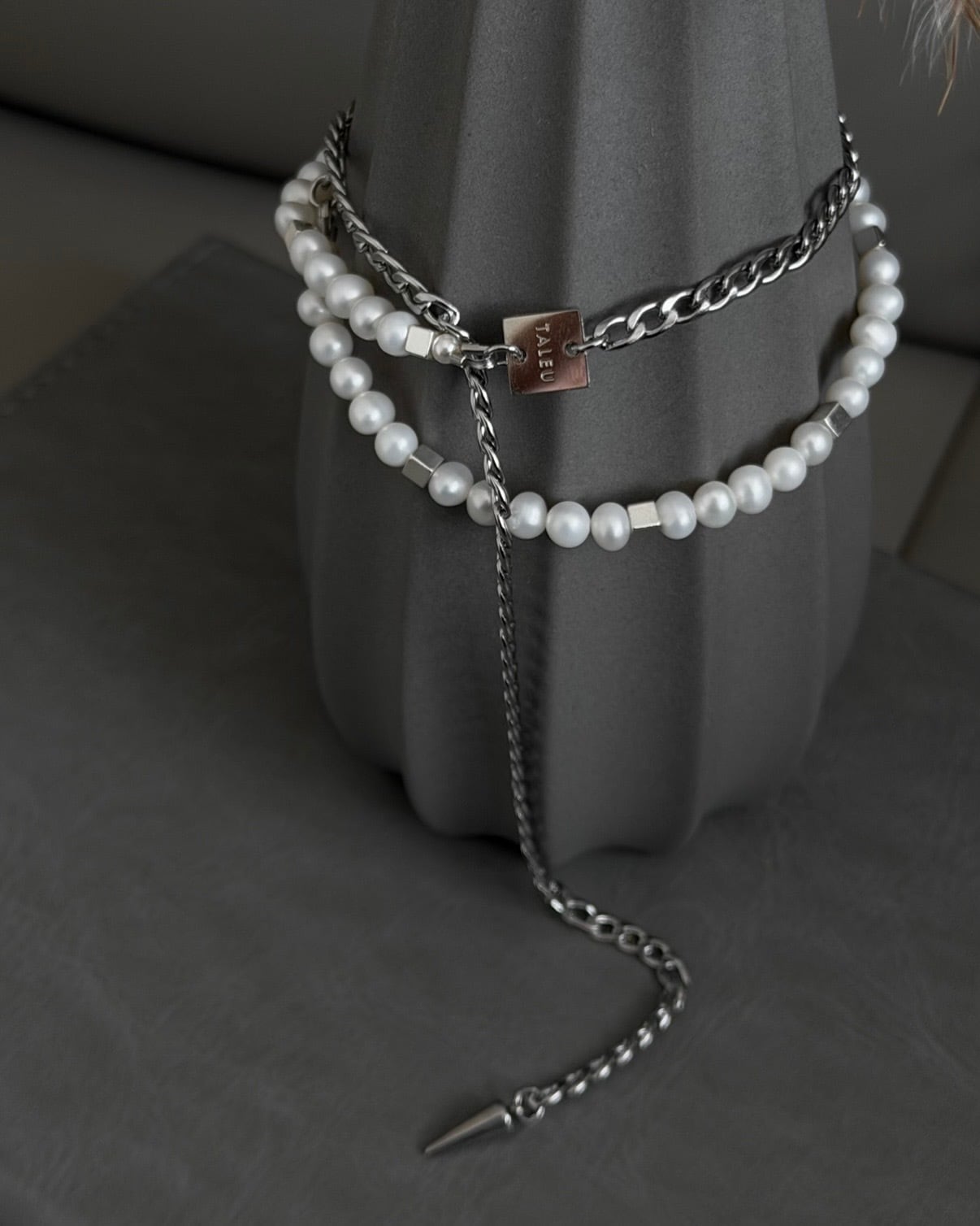 淡水パールとチラッとチェーンが見えるデザインになり